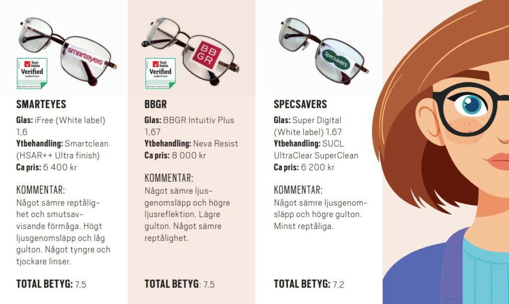 Det kostar att vara närsynt, särskilt om du också börjar se sämre på nära håll. Ett par progressiva glasögon kan gå loss på över 10 000 kronor från någon av de globala glastillverkarna, och då tillkommer kostnaden för bågarna. Ett ackrediterat optiskt laboratorium i Storbritannien fick i uppdrag av Testfakta att jämföra optiska egenskaper och ytbehandlingar på ett antal progressiva glasögonlinser, dels från de stora globala märkena, dels från optikerkedjor som säljer linser under eget namn. Alla glasögon är beställda med samma recept på synfel och i samma bågmodell. Sex av sju linser har brytningsindex 1,67. På Smarteyes fick beställaren brytningsindex 1,6 vid beställningen av de bästa glasögonen. Viktigast med ett par glasögon är givetvis att de uppfyller de optiska kraven utifrån receptet. Här hade testlaboratoriet mycket lite att anmärka på.